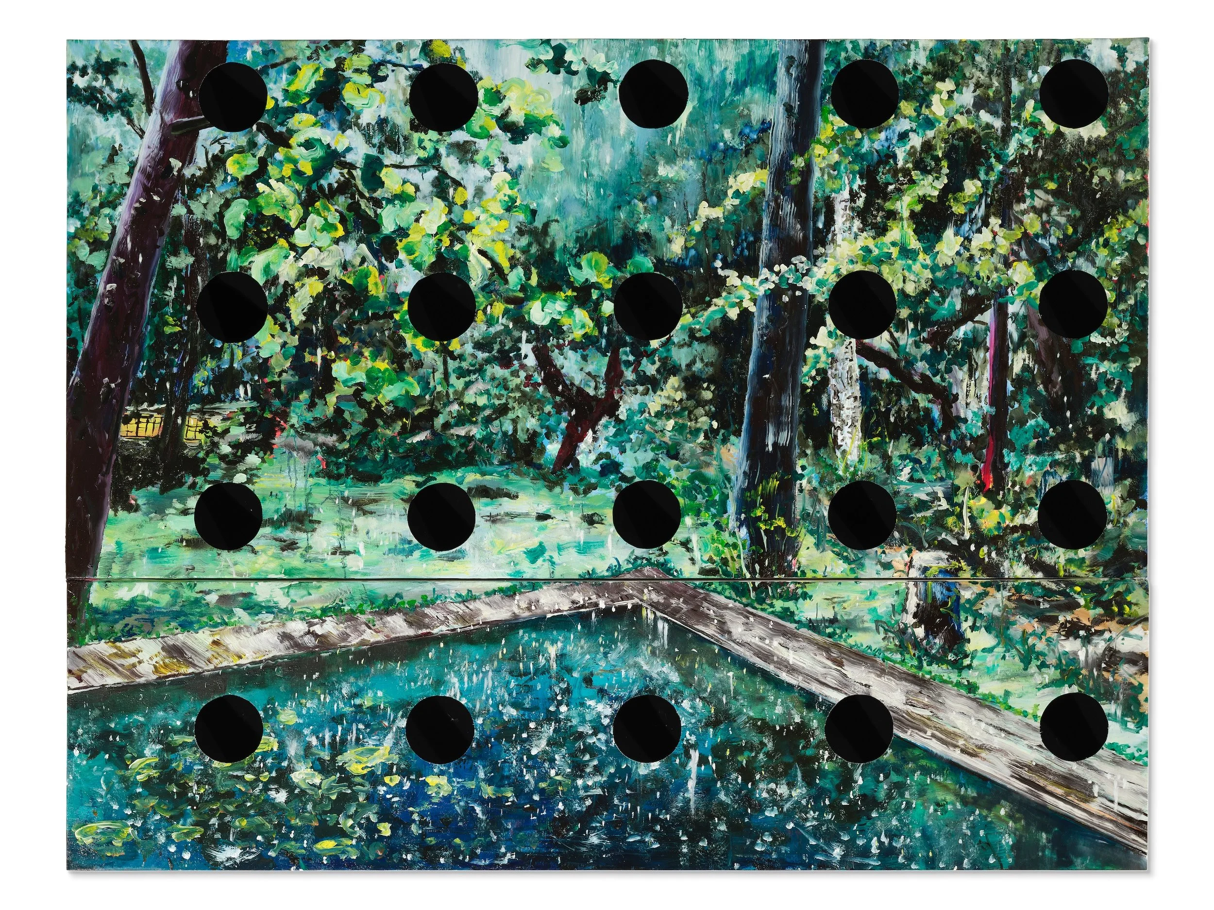 Stel je een enorm woud voor die de gevel overwoekerd. Hier en daar doorkijkjes naar een ver landschap. Bomen, bladeren, tropische indrukken en bloemen. Dit enorme levendige en bonte tableau wordt doorsneden met zwarte gaten. Dit is onze toekomst.